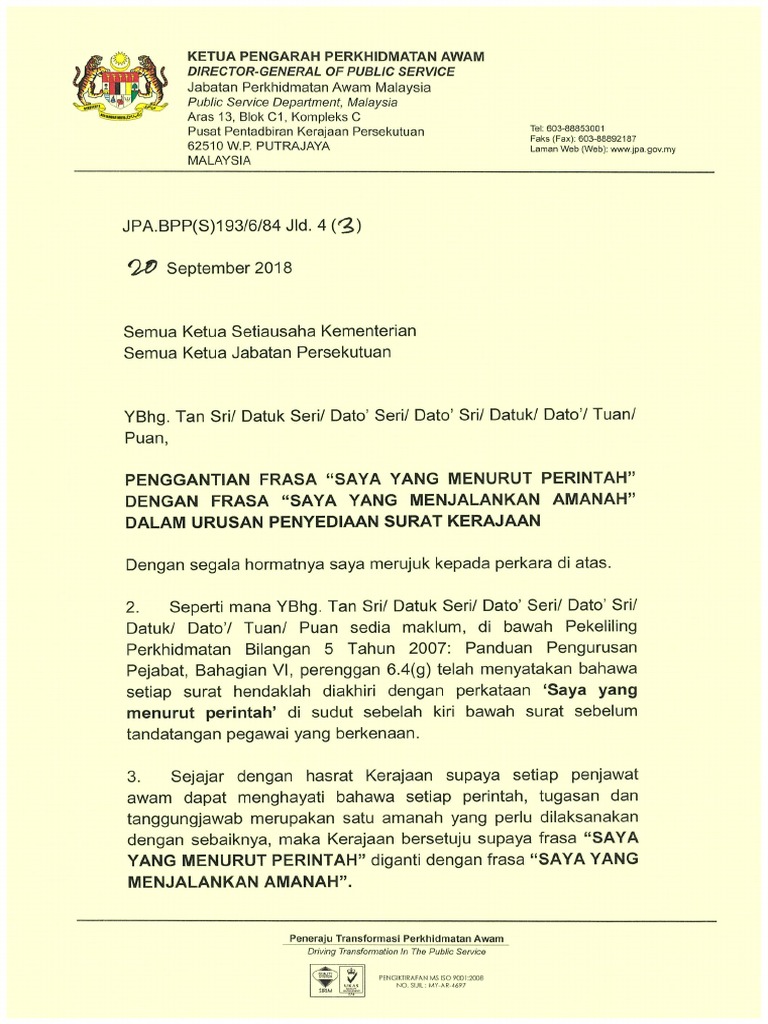 تويتر Bernama Tv على تويتر Surat Rasmi Kerajaan Perlu Diakhiri Frasa Saya Yang Menjalankan Amanah Berkuat Kuasa Hari Ini Ketua Pengarah Jabatan Perkhidmatan Awam Datuk Borhan Dolah Https T Co Nekbiuu3l7